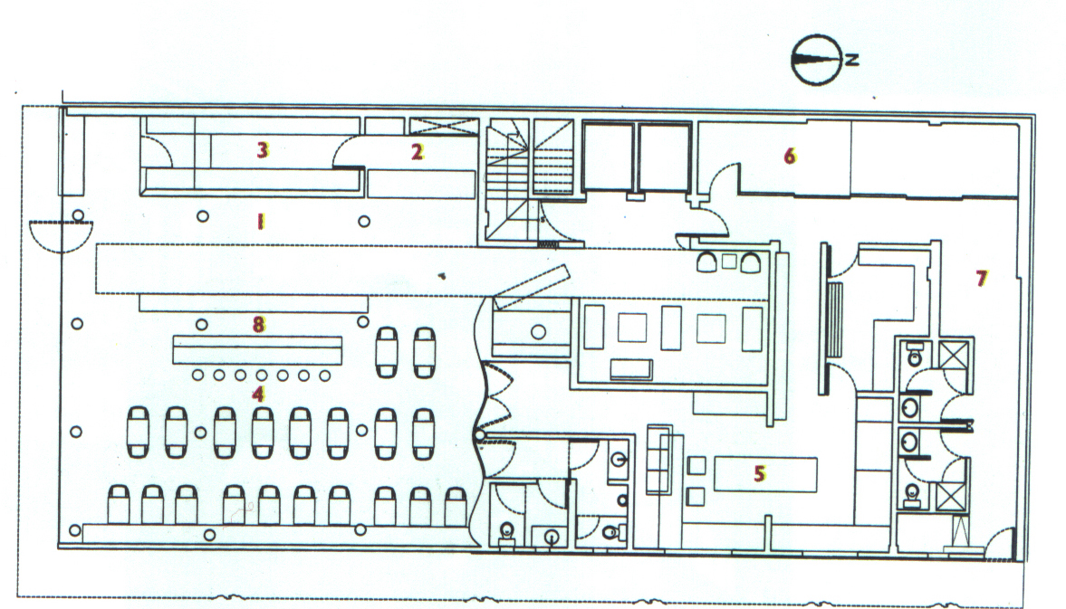 一樓平面圖 1大廳 2接待 3辦公室 4餐廳 5廚房 6植栽 7服務空間 8吧檯