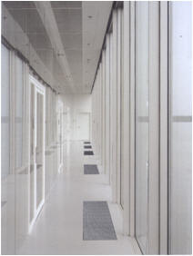 面臨海灣側,玻璃外牆的做法達到與海相當接近的視覺感受 -室內的演練空間使用大量的玻璃外,天井的採 -天花板採用沖孔板,也將