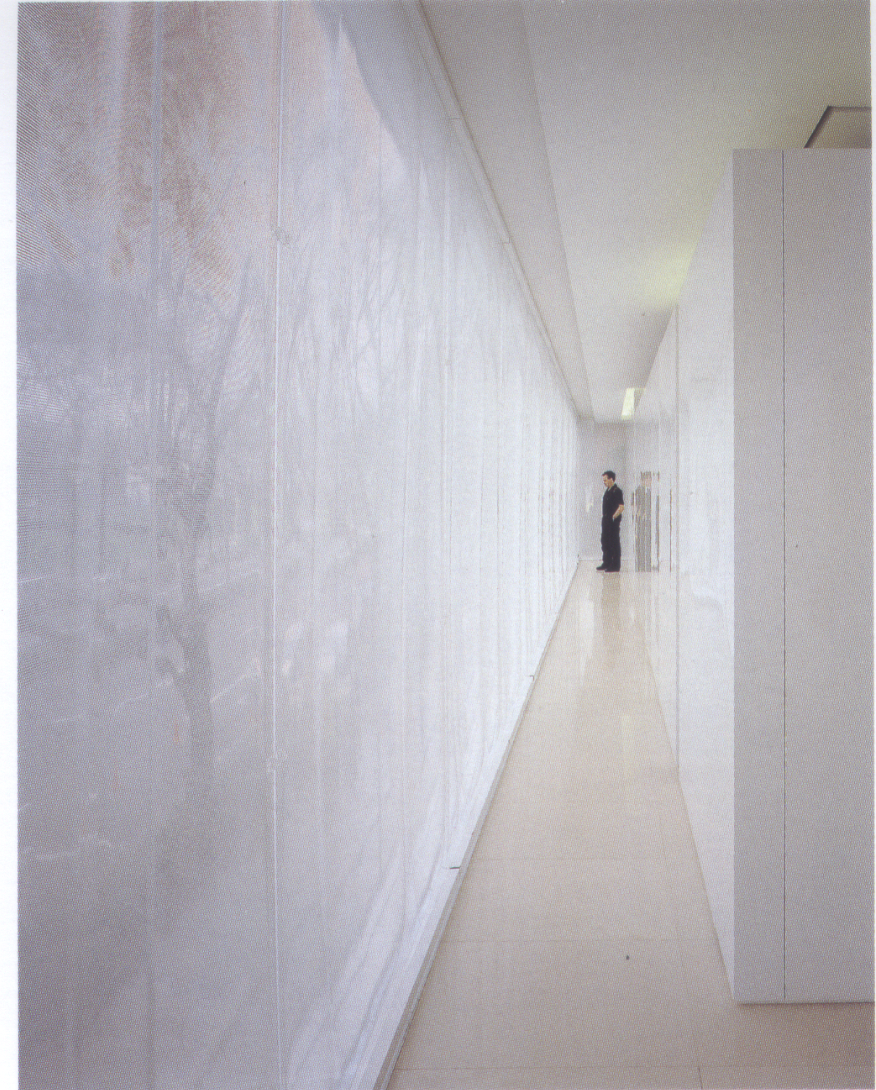玻璃背擋以間距放置,玻璃檻在上下部之框架,讓空間更加乾淨,讓人在室內感受不到玻璃的存在,只有半透明的帷幕系統!