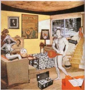 Allowey)對於「大眾藝術」一詞的捷稱。此外,作品內的天花板是用月球表面的圖片拼貼而成,階梯上有清潔女工正使用著吸塵器,牆上有古典肖像與現代海報,這些都是當時摩登生活的事物,對五○年代的人們來說,也是消費的流行吸引。