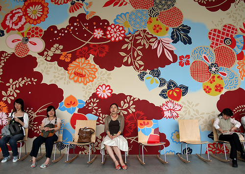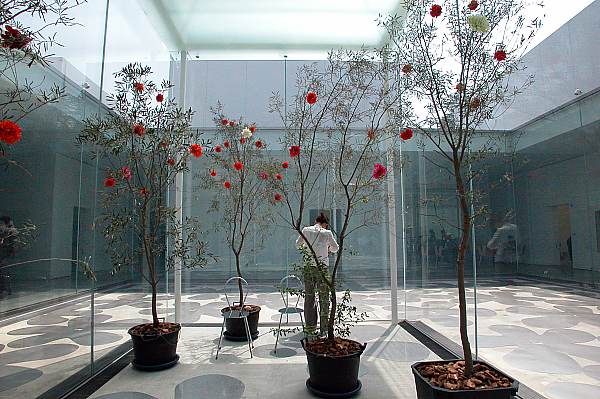 光庭旁有華裔藝術家林明弘所設計的壁畫,色彩濃烈鮮豔的花朵在牆壁上綻放,據說靈感是來自加賀友禪的和服圖樣。前方的椅子則是這位華裔藝術家與妹島和世、西澤立衛的共同作品。