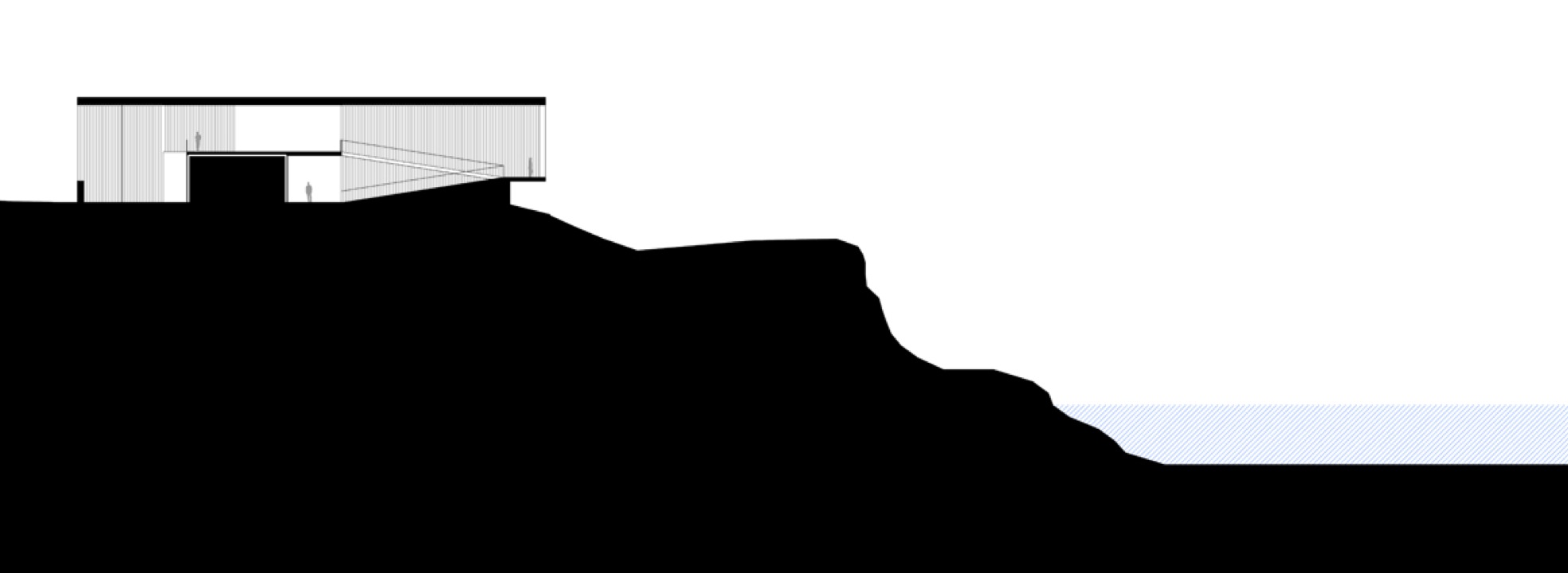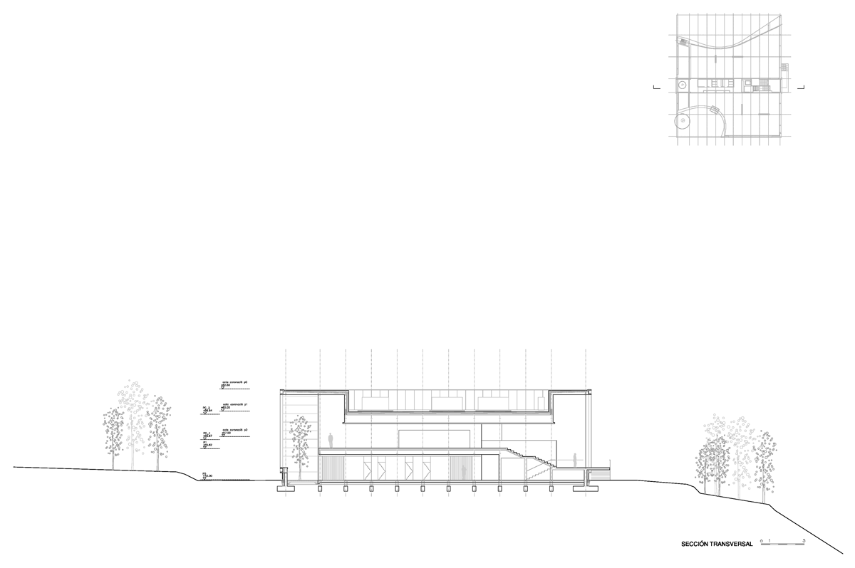 從剖面上可看到樓層間利用樓梯做為連接的同時,也因為基地的關係,在東側也提供了眺望埃布羅河的景觀平台,而在西側,二樓挑空處則種植了一顆樹將綠意引入室內且強化樓層之間的交流