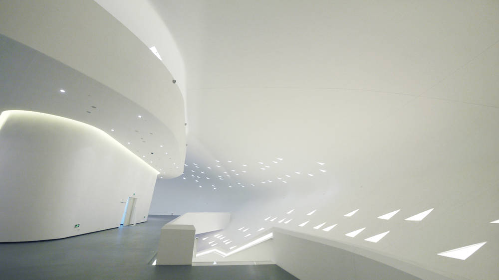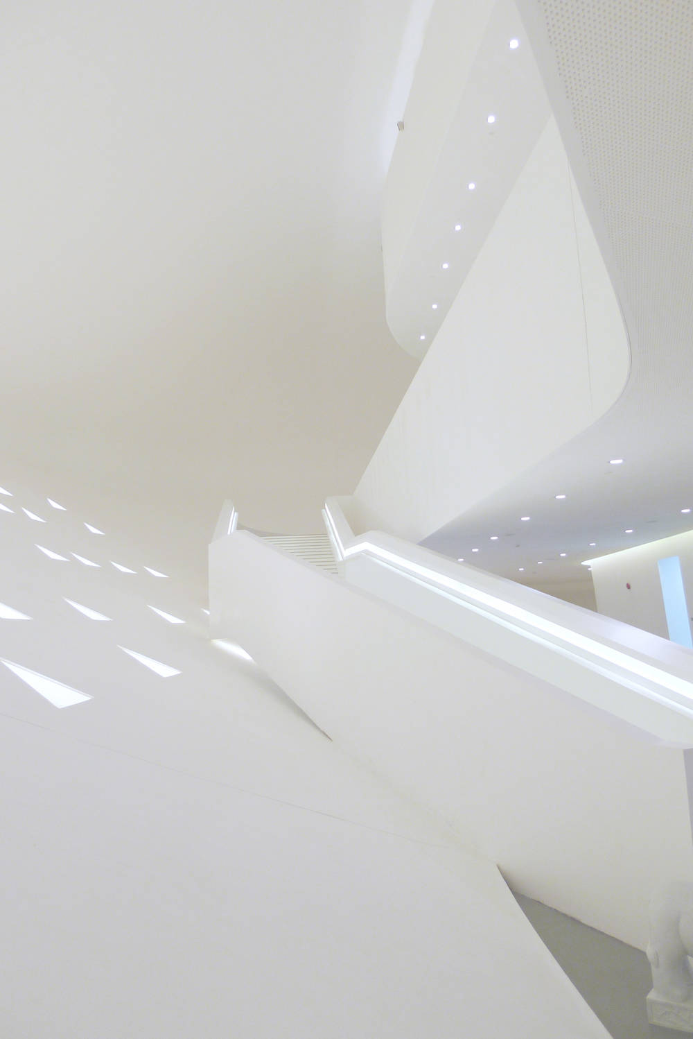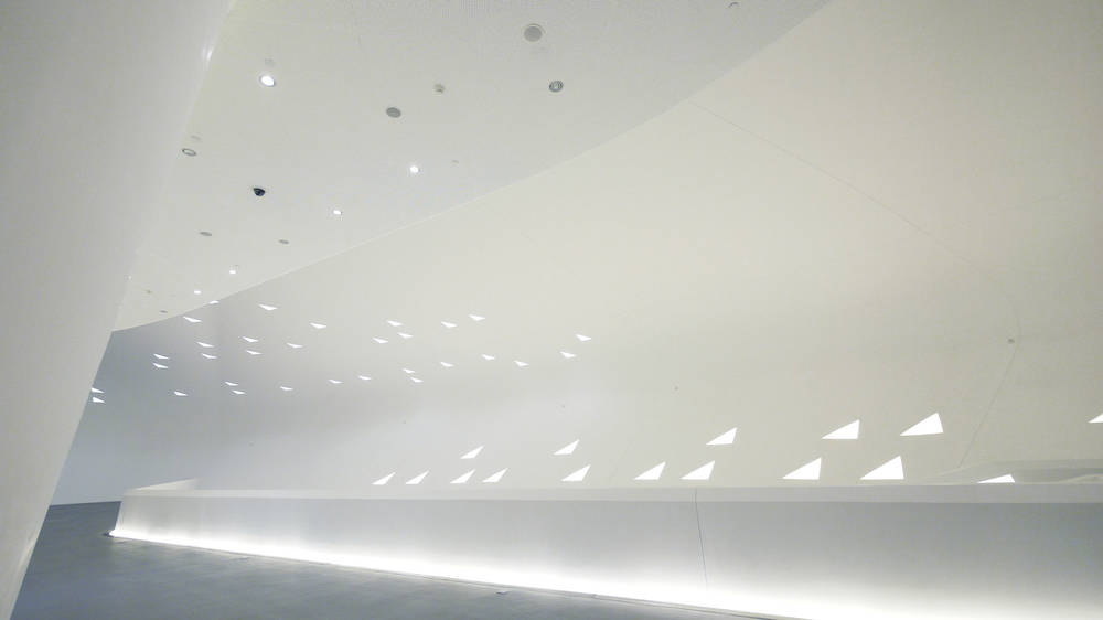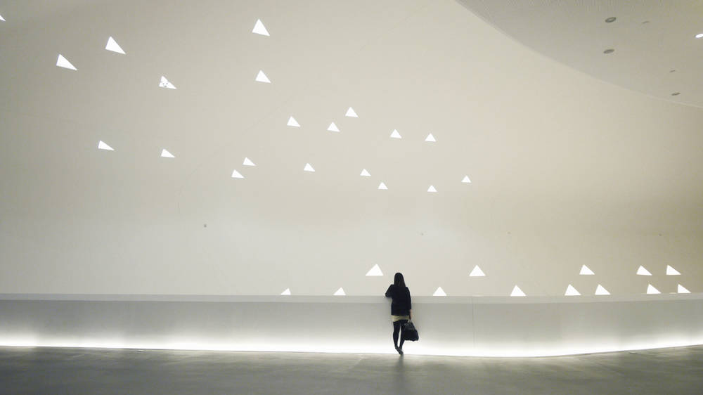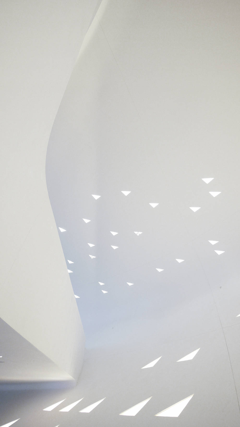 建築變成了一個極簡純淨的背景,僅僅有一些隨機散落的三角形小窗戶跳躍在其上,為這個空間增加了更多的動態感