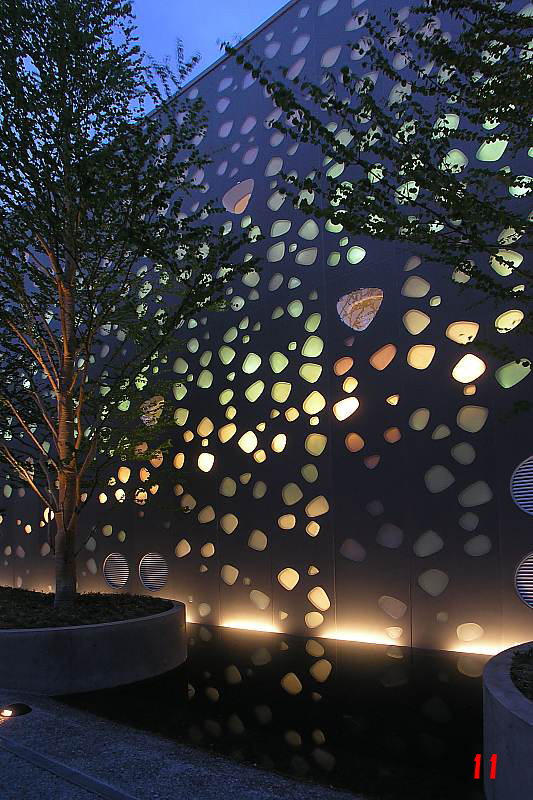 在外觀使用GRC鑲嵌板再以玻璃嵌入,隨機的開洞,使柔軟的光線透入室內,夜晚外牆