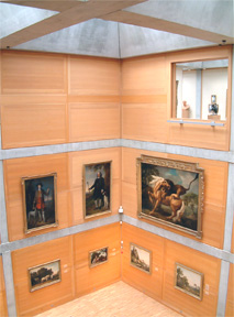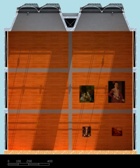 屋頂結構體間全部設天窗採光,用自然光作為頂層和挑高展室的直接光源,展示畫作掛在人視線可接受的較高高度,配合著經過屏蔽的日光照明,以利觀賞者能欣賞到更多正確的畫作細節。