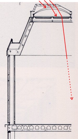 每扇天窗之上,透過計算該地緯度的日照角,裝置了金屬格柵羽板遮住較強的直射光,讓和緩的日光穿透格柵分散至第一層曲面玻璃後,再聚集在第二層霧面的平板玻璃上均勻地散佈灑下,而多數有害的射線也藉著玻璃過濾。天窗下方的RC結構體表面平滑、光亮,有助於光線呈現出柔和色調,其傾斜的角度