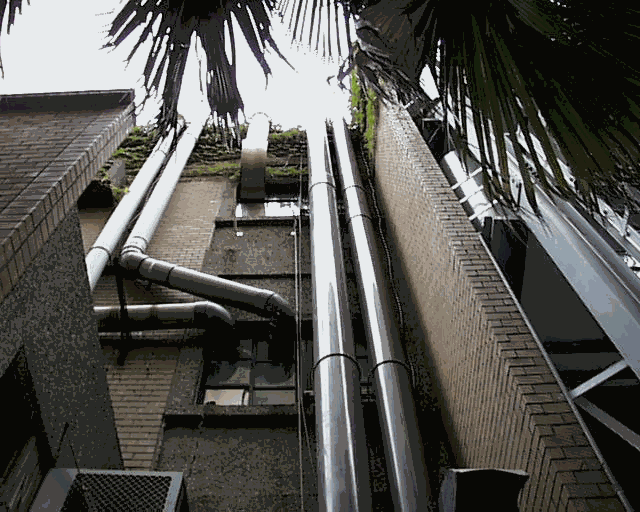 入口 中介 MASS 中介 中庭 陸、結果與問題 A:對現實環境條件的取捨 B:目前外觀上的變化 本棟建築很有趣的現象就是,現在外觀上長出許多有趣的「管子」,這雖然是由於現在機能上和原來需求設定不同所致,但也是一個值得設計者思考的問題,在現代主義「形隨機能」的口號下,如何去作進一步的思考,值得深思。 C:後現代表現特質 D:四度空間的表現 E:觀景式中庭的觀念