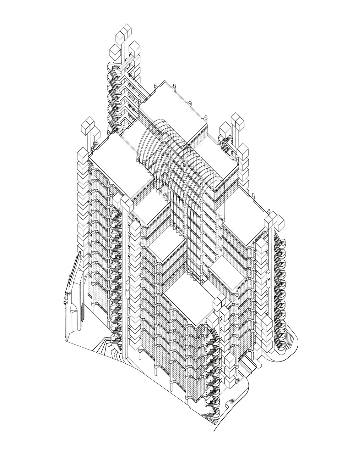 本案例現為倫敦經貿中心,由Richard Rogers操刀設計,玻璃鋼骨結構的矩形平面,外圍有六個衛星式塔樓,主要提供電梯、洗手間以及其他服務空間,設備空間也是設計在屋外。因為被服務的空間是永久存在且較為不變的,而服務空間則是在短期內,可能需要保養、更換,因此本案服務空間採用預鑄的組裝方式。