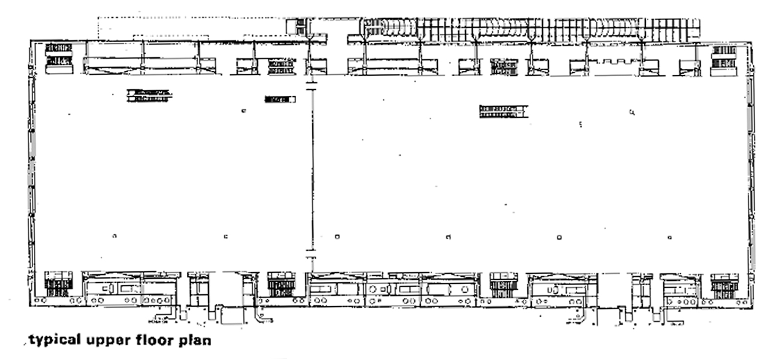 每層樓板尺寸170公尺x48公尺,兩列柱又之間用鋼管組成的桁架樑承托五塊大型開放式樓板樓板。各樓層之間的展示區沒有固定的垂直隔間,是一大片的開放空間,裝有活動式隔屏,管線則從天花板或地板穿出,以免限制彈性使用的可能。