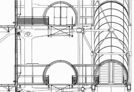 走廊、管道、防火梯、電扶梯、電梯、柱子和繫件等一般會妨礙空間流通之服務管線均安置於建築物外側,設計者曾設想連樓板都可以上下移動,來調整樓層高度,但未能實現Rogers 說戶外梯的設計,不是為了造型而造型,是讓人能領略廣場的活動。