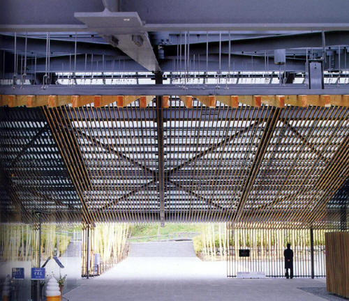 安藤廣重美術館最讓人印象深刻的是入口處具有自明性的屋頂構築形式,透過半透明的波浪狀玻璃屋頂可以清楚的看見隈研吾的多層性屋頂構造,中間是主要的鋼構架系統,鋼構架系統的上方是一層半透明的玻璃材料,在鋼構架上又架上了一層支撐著屋頂垂直狀木質百葉的框架系統,在鋼構架下方以金屬構件吊掛另一層木質百葉。這個入口處的屋頂構造很清楚的讓人看清楚鋼構造框架系統與表面材料的關係與節點(articulations)處理,但就構築性的觀點而言,隈研吾並沒有在細部上作出具有發展性的處理,類似的鋼質框架式的結構配合木質百葉的細部處理手法其實相對於其他著重細部的鋼結構建築作品而言是低技術而且原始的作法,隈研吾曾言及馬頭町是一個完全異質於一般都會型美術館的鄉鎮型美術館,他認為通常日本美術館都有相同的特色,那就是使用混凝土牆與昂貴的材料,如大理石等,這樣的材料在馬頭町反而顯得突兀與不正當。隈研吾試圖從建築的地域性出發,說明馬頭町不適合出現都市型的精細材料處理,但從隈研吾近設計過的建築案來看,他除了1995年在日本靜岡縣熱海市的玻璃住宅案中針對樓梯與天橋作出特殊的高技術結構性玻璃的嘗試,其他的建築案多數是低技術性的細部處理。