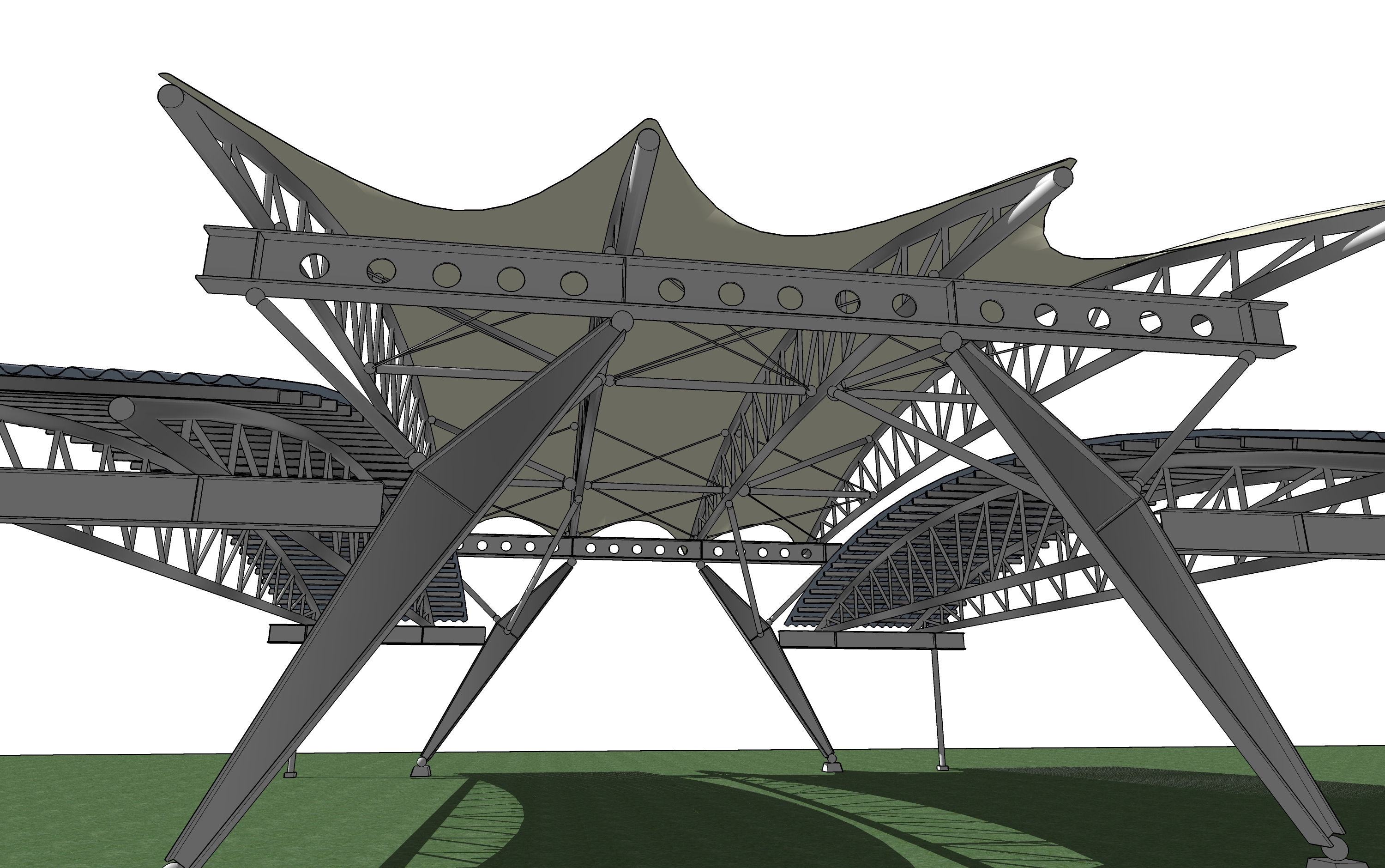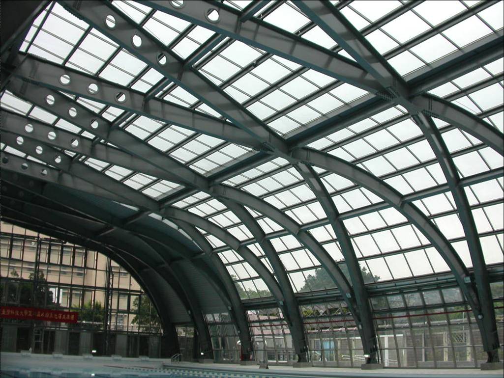 大跨型鐵皮屋,廣泛應用於本土之廠房、大賣場、大跨體育設施等場所。其特色在於使用框架式鋼骨構架,外覆鐵皮浪板或其他飾面。雖然此種構築模式極具經濟與工期之優勢,但其巨大的量體、粗糙的外貌、薄弱的涵構考量以及貧乏的建築物理性能,形成台灣城鄉景觀及建築的一種問題。 有鑑於此,尋找台科大游泳池屋棚增建之理想解答並非為本案的唯一目標,如何精緻化本土大跨鐵皮屋系統方為本案更進一步的企圖。 |
