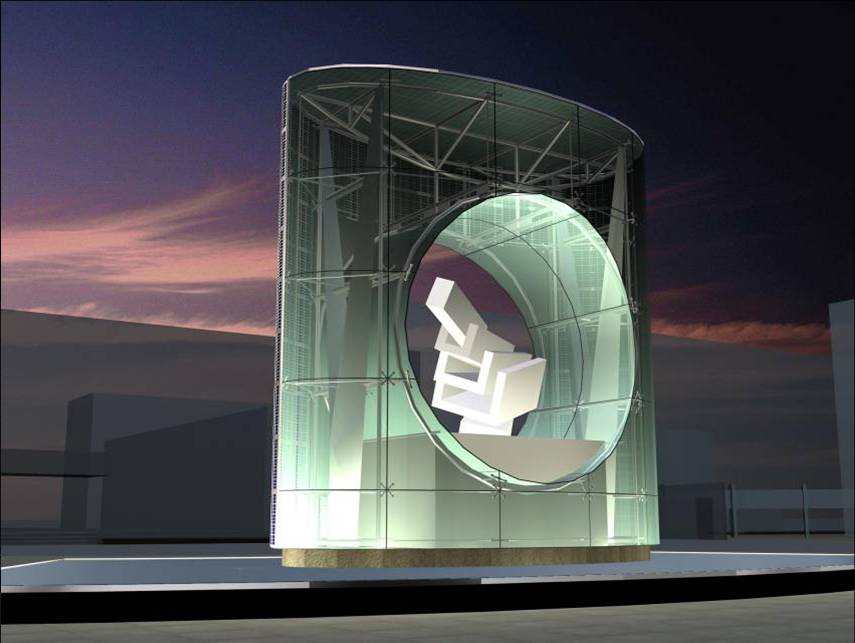 本設計擬於公共廣場入口空間中設置一太陽能景觀雕塑,其玻璃外殼之透明質材代表宇宙太虛。太虛中的「箭形雕塑」象徵人類追求生存與進步的科技文明。 「太虛射日」意指人類在浩翰宇宙中,運用科技智慧(箭形雕塑)獵取太陽為其所用。太陽在為蒼生萬物汲取之後形銷體逝,於太虛中空留一「圓洞虛體」。其能量轉而在太虛中發光發熱(夜間照明),此即「日射太虛」。藉此意喻人類利用太陽能的積極努力。 |