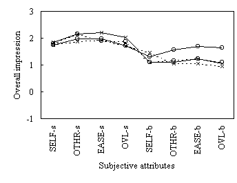 Averaged data of overall impression (solid line) and hearing oneself