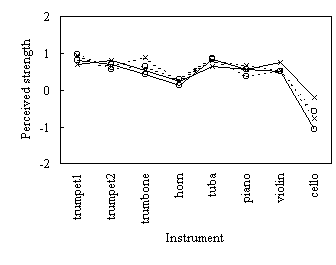 piano/ brass/solo) among parameters and acoustical measures. Coefficients with