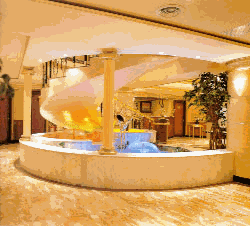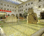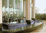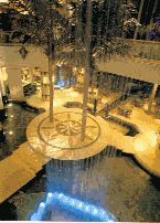 建築庭院空間中水的光影有三種變化:一是水面本身的波光,二是利用室內池水中天棚燈光的倒影成景,三是波光的反射,這是水面獨有的特性。 |