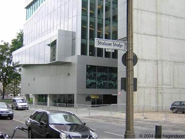 設計議題:不同於周圍的建築 在方案上的要求,外交部的外交事務要求隱密的建築物,在這個環境中明顯可見的不一樣建築,這個區分的請求隔離了傳統的柏林區塊以及大使館使用區塊,另一個希望能表現”荷蘭人的寬大”(荷蘭的寬廣) -OMA WEB SITE 形式手法: 以資料來看,周圍都是柏林的古舊建築,在柏林大使館Koolhaas使用鋁片覆蓋著牆壁,並且使用彩色玻璃,並且加上前面所提到的解決法規的手法,這兩個手法突顯了該建築在這個區域的獨特性,偶而突出建築立面的廊道和突出懸空的會議室史建築物更顯得突兀,與附近的建築形式形成強烈的對比。