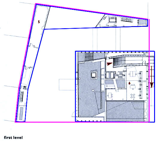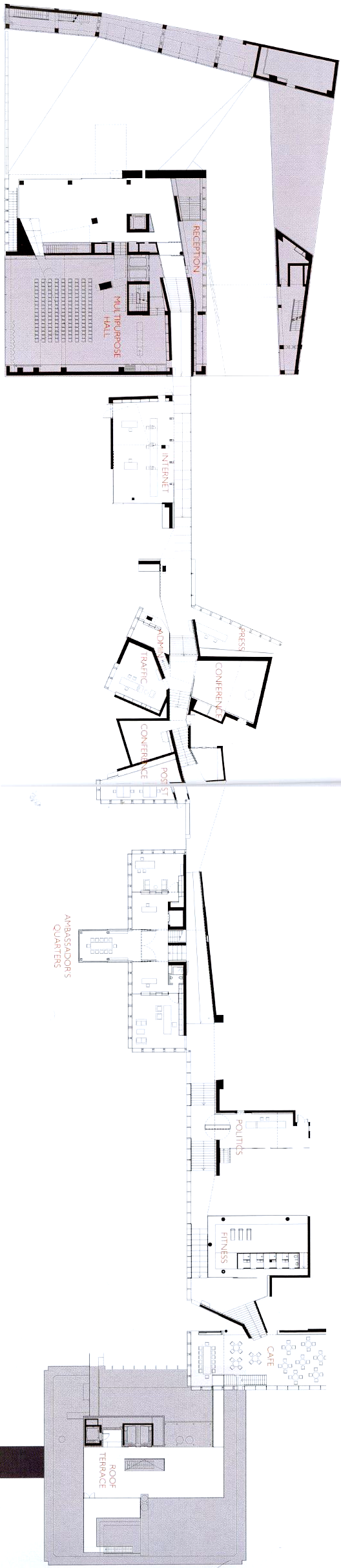 設計議題:在方塊內產生軌道 軌道使用波道和階梯的方法連接聚集而成的大使館”公共”空間。 大使館個空間可以被分割為兩個群組:公共與私人,公共與自治的空間沿著軌道,而私人辦公室位於軌道與建築物正面之間,公共的空間像是討論設備和會議室。 -OMA WEB SITE 形式手法: 用一條"軌道"來連結所有的公共空間:接待處-->多用途大廳-->網路區域-->各個外交部門-->大使會議室-->健身房-->咖啡廳-->屋頂,綿延不斷並且穿插交錯貫穿在建築物內,節節上升。 進入這大使館有如進入一條大使街道,他只有一條通到底的通道,卻可以連到各個大使館服務空間,累了也有咖啡廳與餐廳,感覺有點像是在逛街。