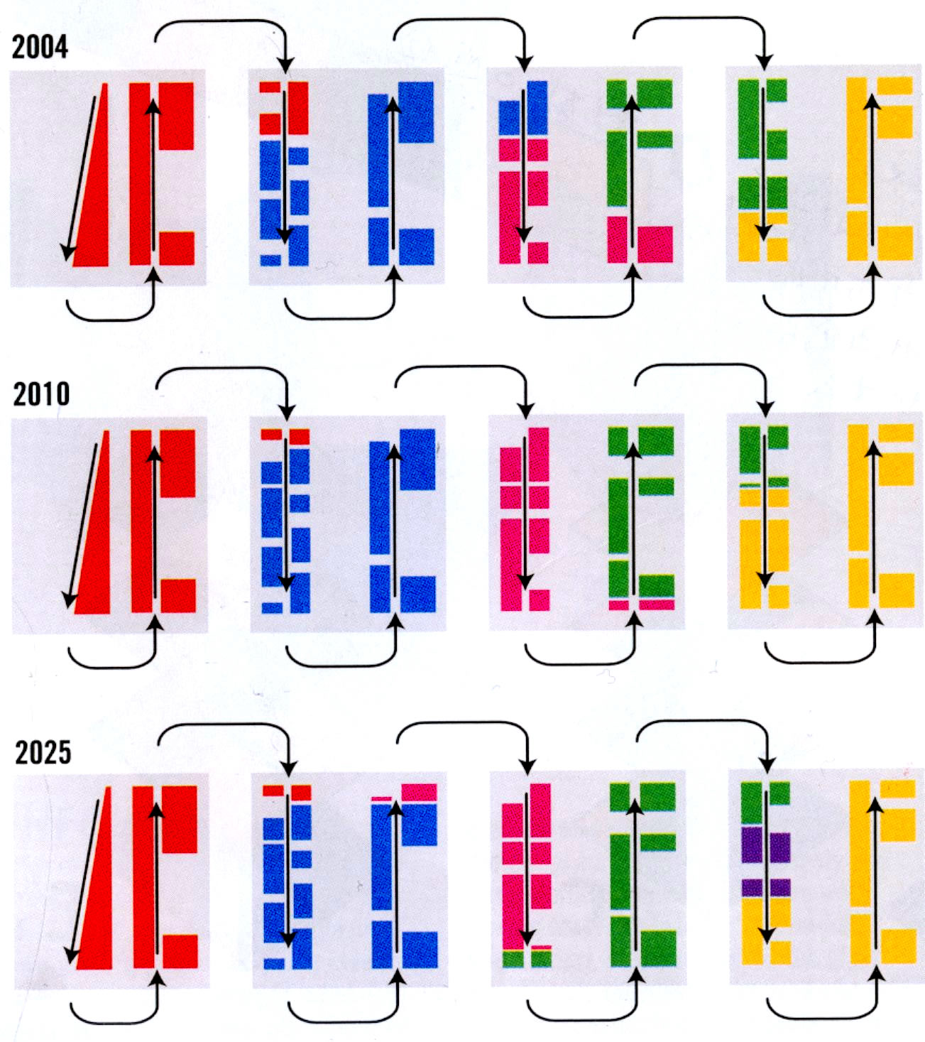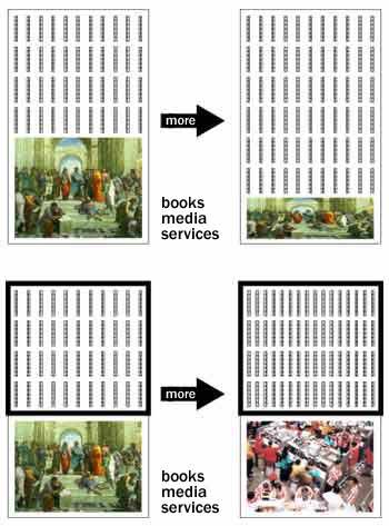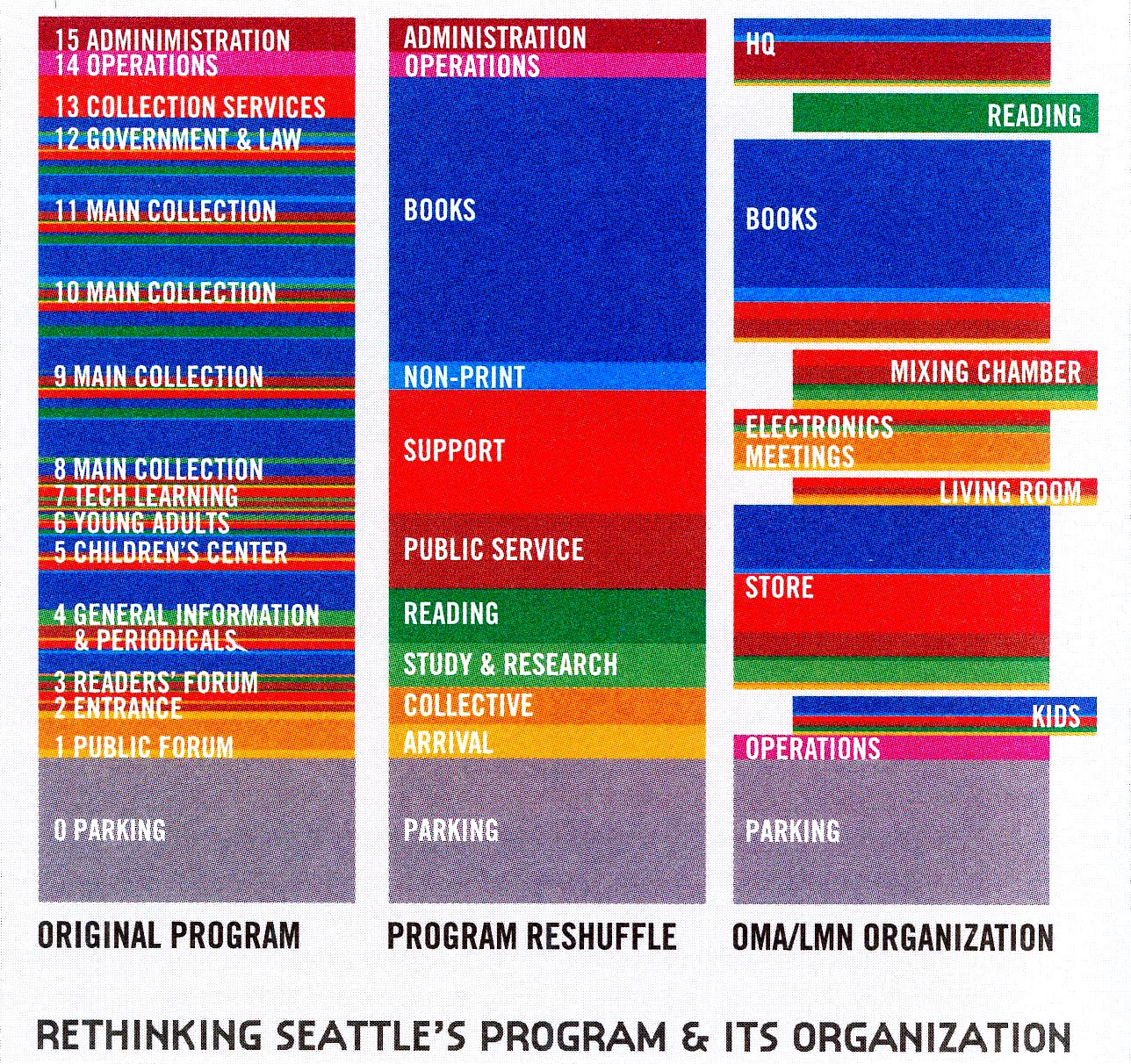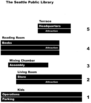 設計議題:靈活性 近代圖書館的靈活性 - San Francisco, Denver, Phoenix – 已經盡可能的在圖書館所有活動及地板空間的使用上有了許多設計。計畫沒有被分開,房間跟一些獨立的空間沒有被給上特定的功用。實際應用上,在書櫃的走道隔間被利用為閱讀的空間,然後才延伸到外面的公開空間。最後,在這種形式的靈活度上,圖書館將會被自己設計的特性給勒死。 -Seattle Public Library Proposal - December 1999 形式手法: 將建築物劃分成數個特定的空間並給予特定的設備及功能。在每一個空間展現其靈活度而不是在其它空間裡有更多的浪費,謹慎的重新設計下,將房間重新改變給其它活動使用。 重新思考Program在圖書館的成長所需的改變,上圖為舊的圖書館思考模式,下圖為OMA的想法。