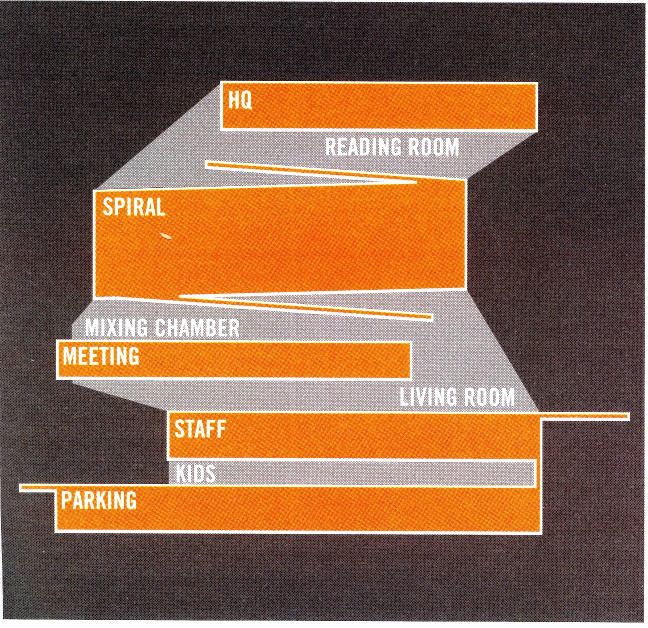 Koolhaas通例手法分析: 1.個體與群體 本案以樓層為個體單位,樓層結合成五個不同平台,平台再以聯繫的RAMP連結,最後成一個大的個體。