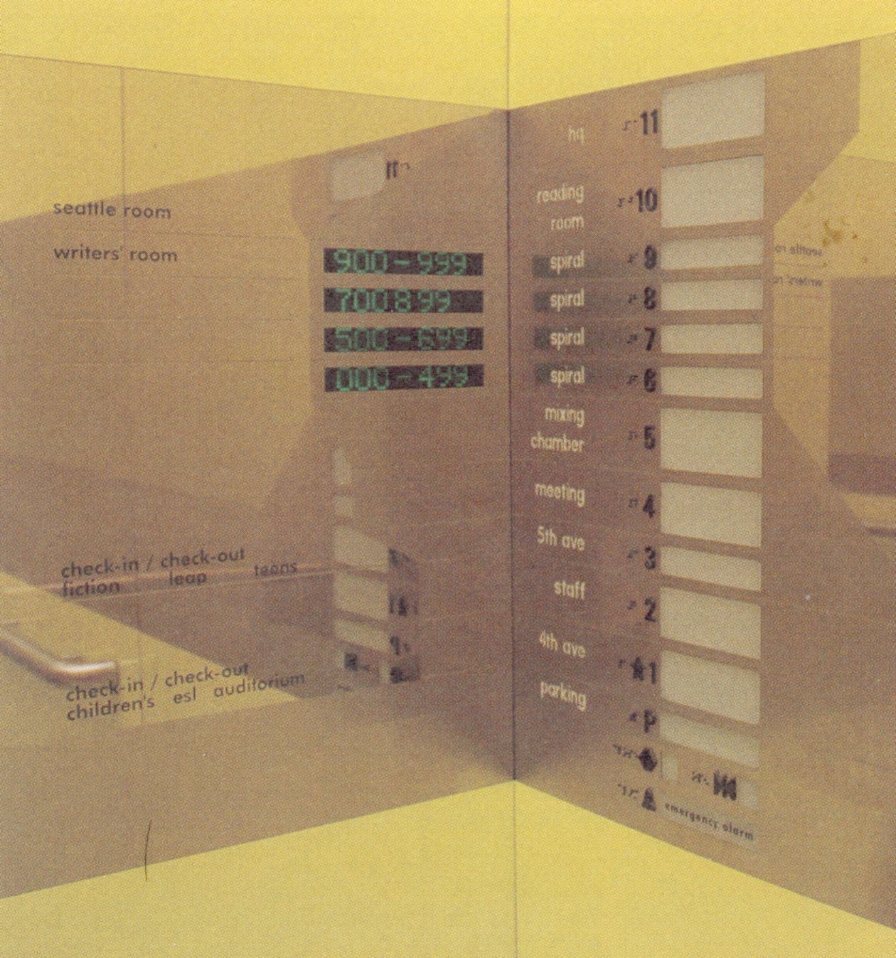設計議題:活的存放空間 連續到2025年的收集可以寬裕的保存在一個被界定的區域內 -Seattle Public Library Proposal - December 1999 形式手法: 使用杜威(Dewey)十進位系統的概念創照一個不間斷的"書的飛舞飾帶"(ramped ribbon of books)。在藏書區域,他建立了一個緩和的螺旋斜坡來連結這四個層樓,並用上述的概念為書本分類並編號,使整個藏書區域的層次更有連貫性,像是書本存放在一整條連續不斷的長廊上。