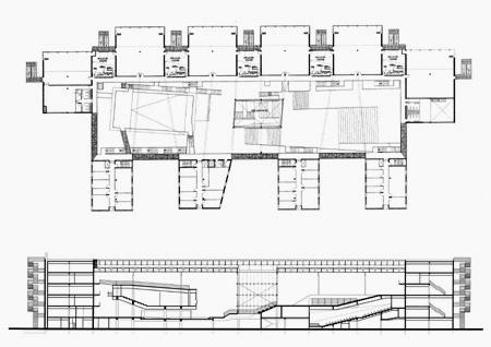 這座建築學院座落於巴黎近郊.創造了一個大型的室內空間.其內部空間設置的禮堂座落於整體建物裡重要位置.創造建物內事件發生的動能核心(彷彿一台發電機).