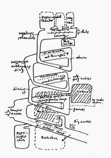 於空間的形式上,利用走道及半層交置引發起活動和行為,在中介空間的處理過程,流動性、滯留性及暫時性並置,事件的發生因集線器的運作而不斷的發生。