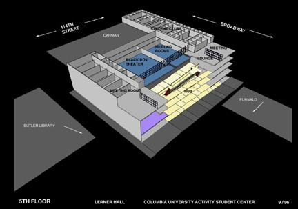 楚米強調的城中城的概念,針對歷史傳統所建構出的紋理加以配合,強調校園精神,將歷史的軸線折成一堆斜坡加以集合;他架接了集線器的內在機制,在主體和客體間不斷的錯置及交織,坡道構成線圈的意涵,人如同電子在內運轉,兩旁的社團提供活動產生所必要的磁力,在運轉的過程中,電子及線圈和磁力相互衝撞。