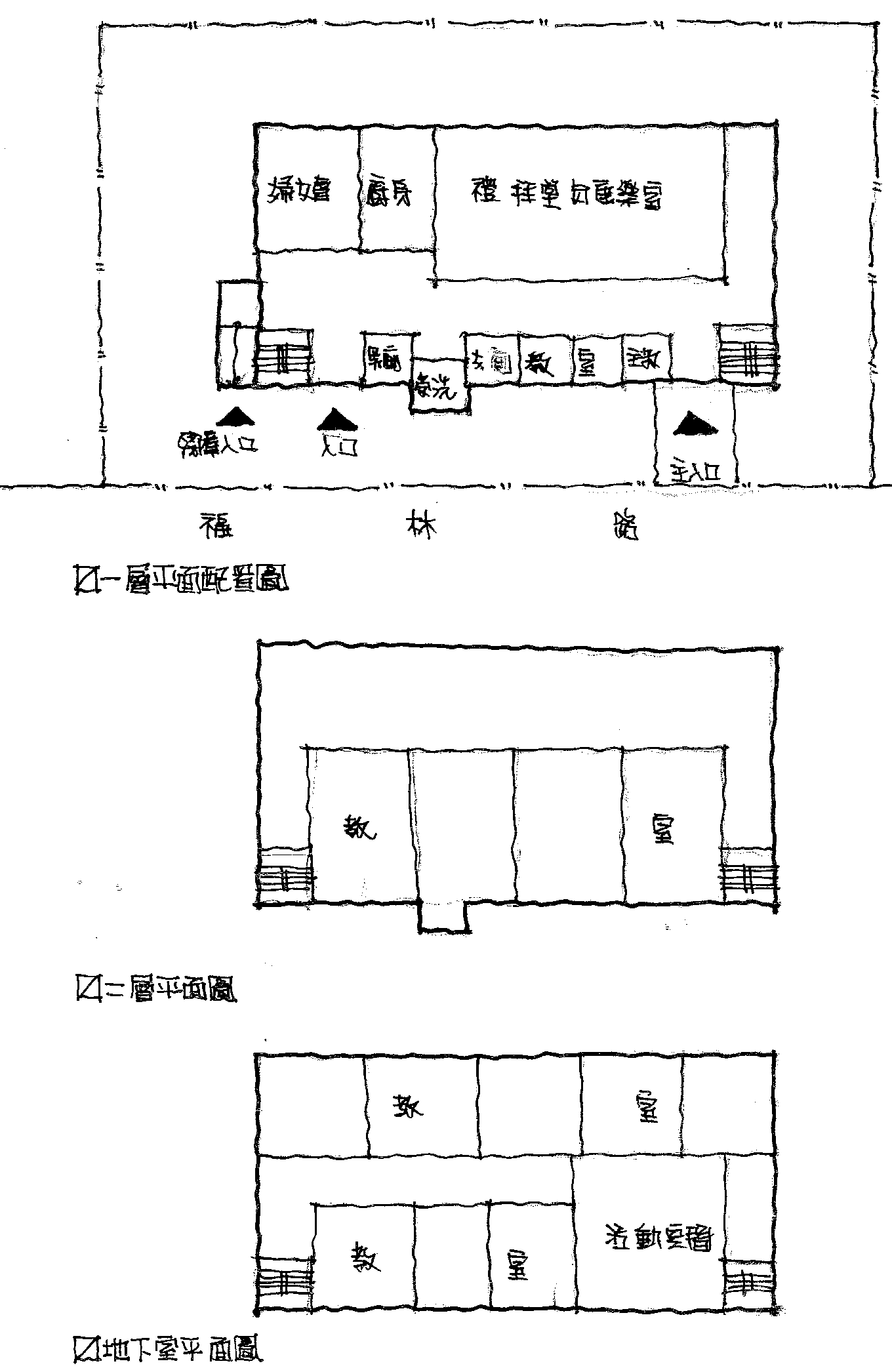 車、景觀與戶外活動場為主。一層的空間組織以中間走廊為主,一邊為禮拜堂