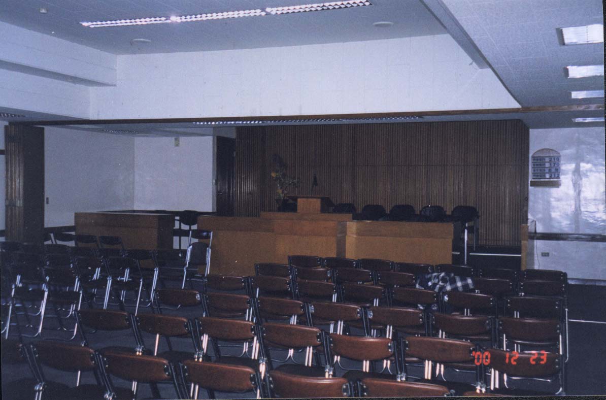 兩圖為禮拜空間一端為禮拜的講堂、一端為康樂的舞台,兩者為互通的,充分 的運用僅有的空間,達到多空能使用的目的,也節省空間的浪費,並以移動式 椅子已增加空間使用的變化性。 |