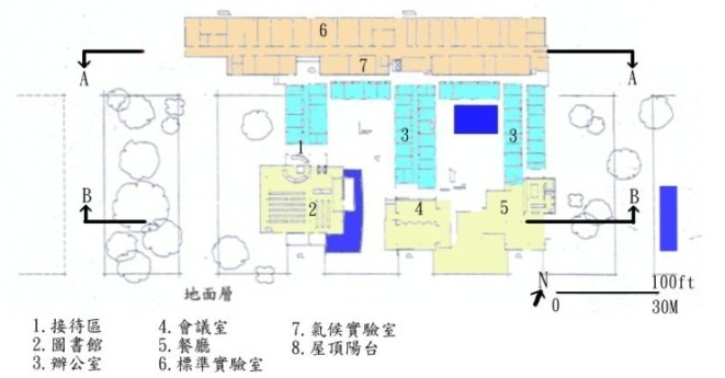 平面行狀就像一個E字型,利用兩個玻璃照的中庭,將室內外混合在一起。可開關的窗戶,讓使用者可以自行控制調節溫度、通風。唯一有空調的地方,是在實驗區的地方。早上的辦公室比起一般的辦公室,溫度要來的低,因為旁邊的中庭、水景,產生了冷島效應。