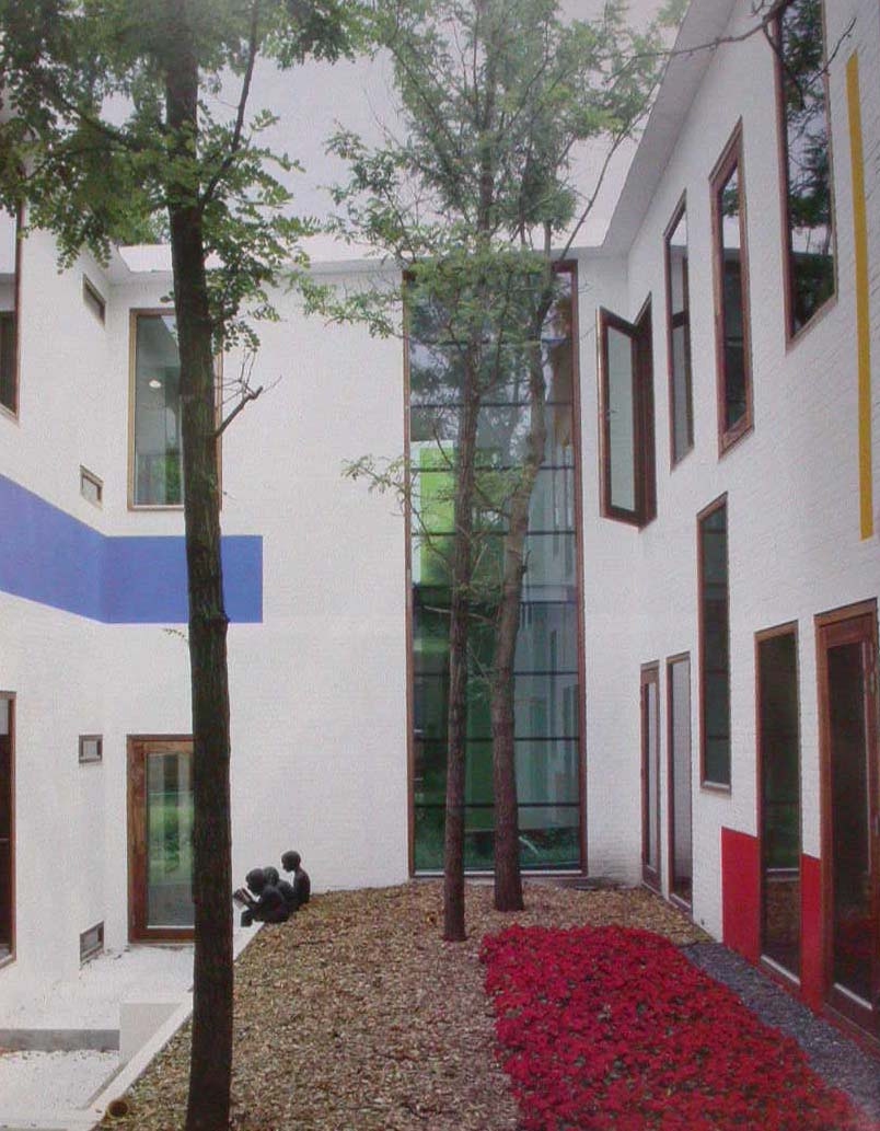 環繞天井的牆則是刷上鮮豔色彩的磚牆,與外部的輕量鋁以及玻璃形成對比。配色為地中海的白色加上蒙德里安式的紅色設計裝飾;活潑的藍色與黃色更加提振精神。