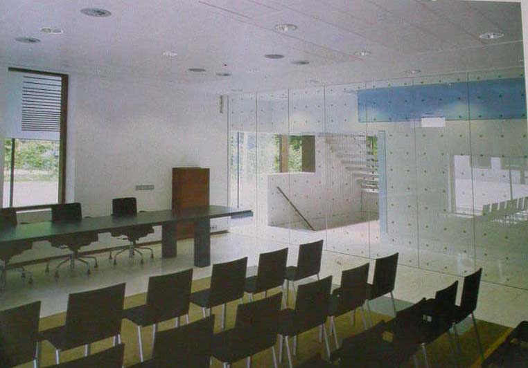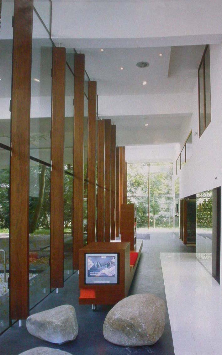 除了一般的分區辦公室以及會議室以外,這棟建築還有一系列用來監督廣播節目的觀察空間;還有像法庭一樣審訊約束廣播節目的議事廳。然而,如此嚴肅氣氛卻以古怪、異想天開的細部手法來襯托,例如,在入口大廳看電視的座位使用大量的卵石。 |