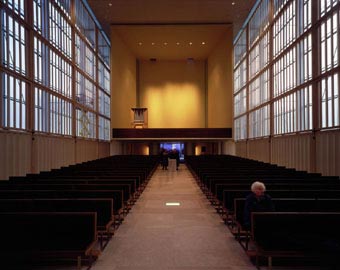 的人更容易接近教堂, 但是為了避免透明的玻璃牆產生商店的櫥窗效應, 所
