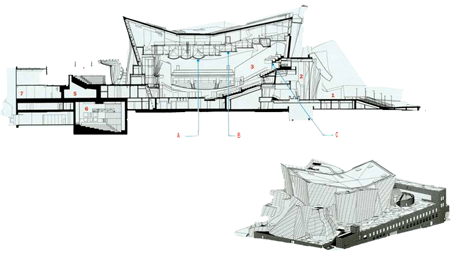在音樂廳內,被影藏的日光漆成藍色的,用木頭包圍直接傳遞至觀眾席的音樂,天花板是最大的聲音面,大量的後置玻璃使得白天的音樂會更特別。