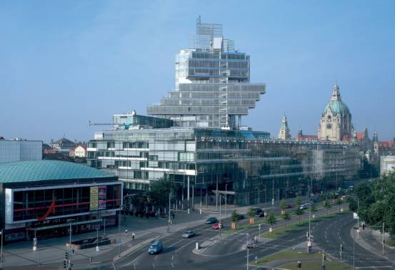 Landesbank(以下簡稱Nord/LB)的全新總部大廈就像是一座城中之城,其中包羅各項機能。它像是一座拔地而起、由玻璃與鋼骨所構成的雕塑品,量體與量體間用大膽的手法彼此堆疊交錯,並且有一大部分懸桁在空中!這樣突破創新的手法在本案所在城市漢諾威極為罕見─漢諾威本身是一座「保守」的德國城市,由於靠近過去的東德邊界,因此無論是在經濟發展或者是二次大戰後的重建工程都落後其他西德地區,再加上長年的都市區劃限制,造就了低矮而一致單調的城市景觀,就連2000年漢諾威世界博覽會的尖端風格建築群也未能帶來明顯的衝擊與影響。Next Page>