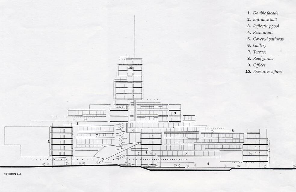 1. 雙層立面 2. 入口大堂 3. 水池 4. 餐廳 5. 空橋 6. 藝廊 7. 平台 8. 屋頂花園 9. 辦公室 10. 行政主管辦公室 Drawings: [Plannings][Section]