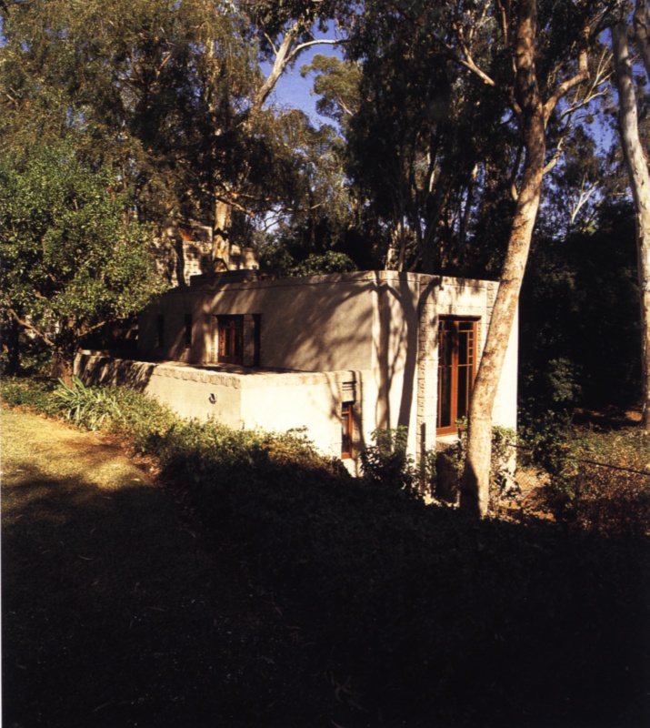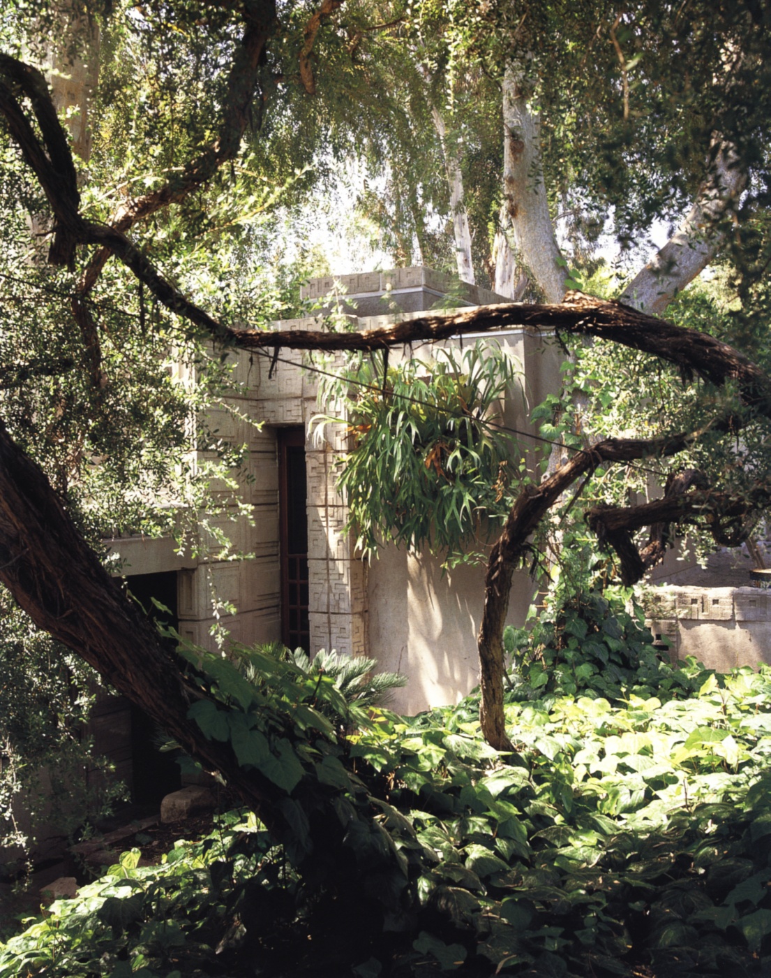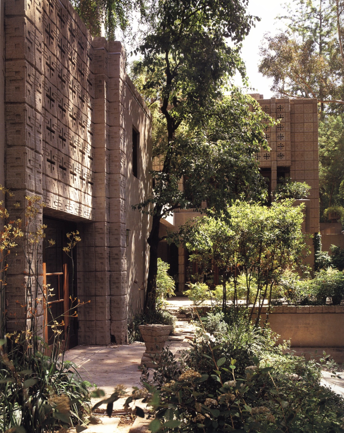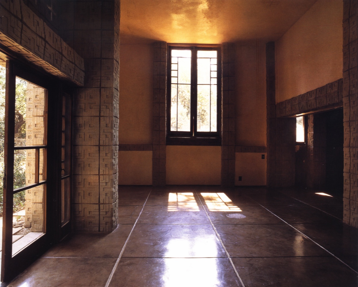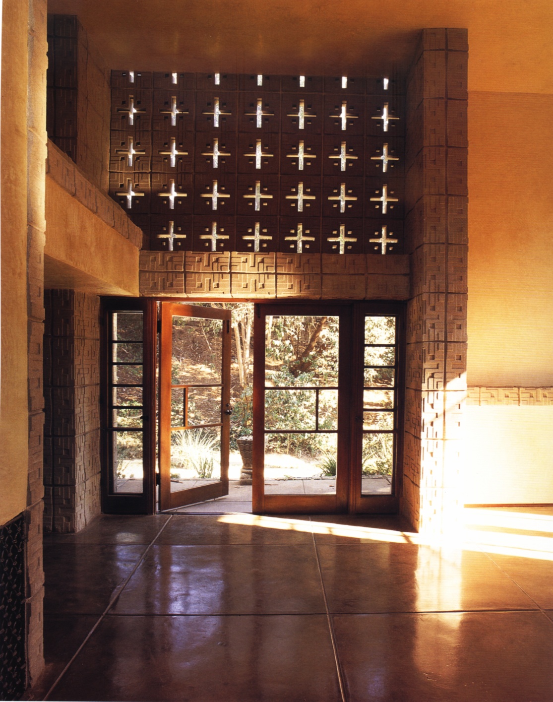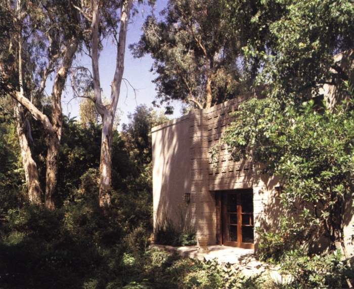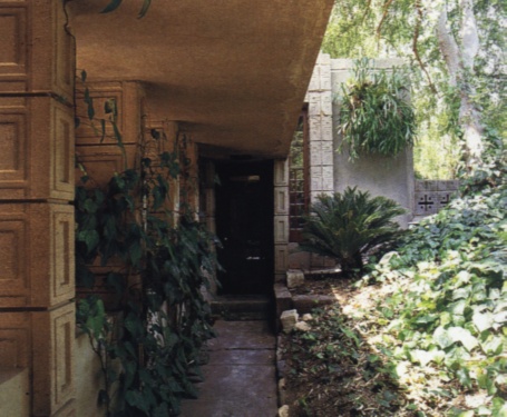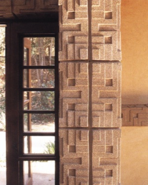 One of many opportunities that came to Wright through his father was a commission for Alice Millard, an antiquarian bookseller and client of two Frank Lloyd Wright houses: a Prairie house (1906) in Highland Park, Illinois; and La Miniatura (1923), a concrete block house in Pasadena, California. In 1926 Millard returned to Frank Lloyd Wright to design a separate gallery for her collections, later called the Doll’s House or Little Museum. After waiting three months for a response, she gave the commission to Lloyd on the condition that his father approve the final design, which he did. Wright designed a modest, rectangular stucco building that was sited adjacent to the pool and connected by a covered passageway to La Miniatura’s living-room terrace. He used patterned concrete block around the doorway and windows to alleviate the studio’s severe form and to harmonize with the design of the house.