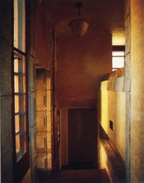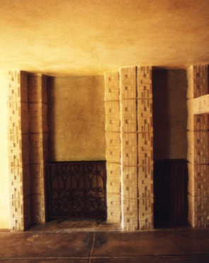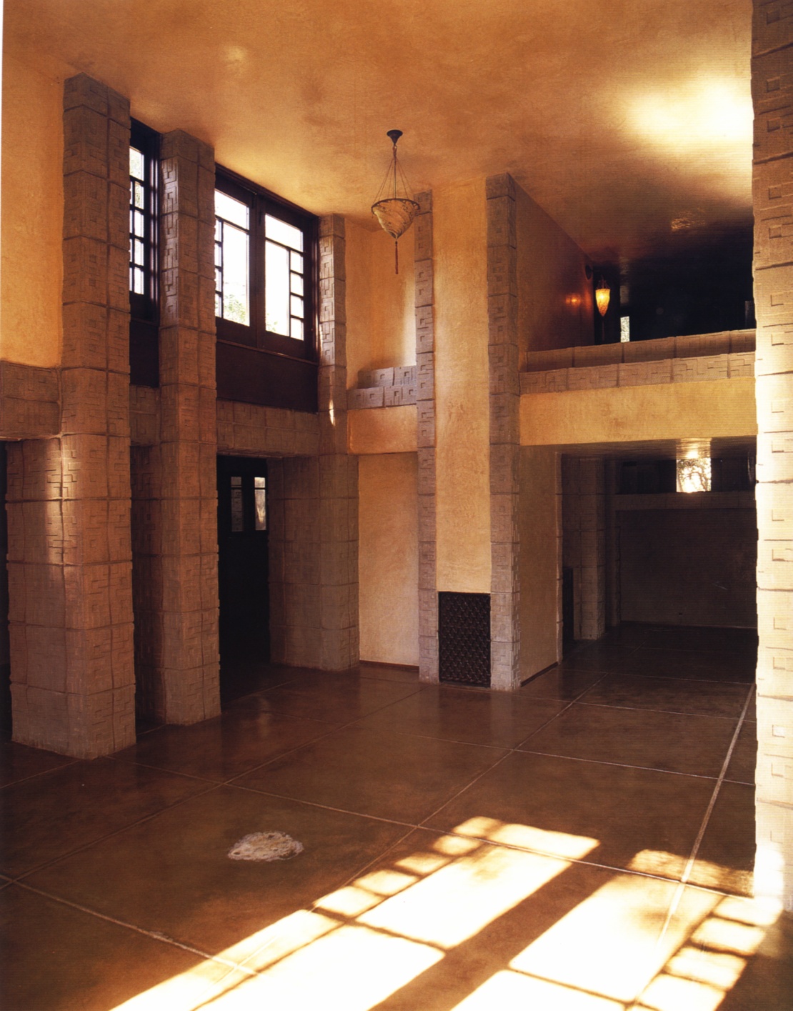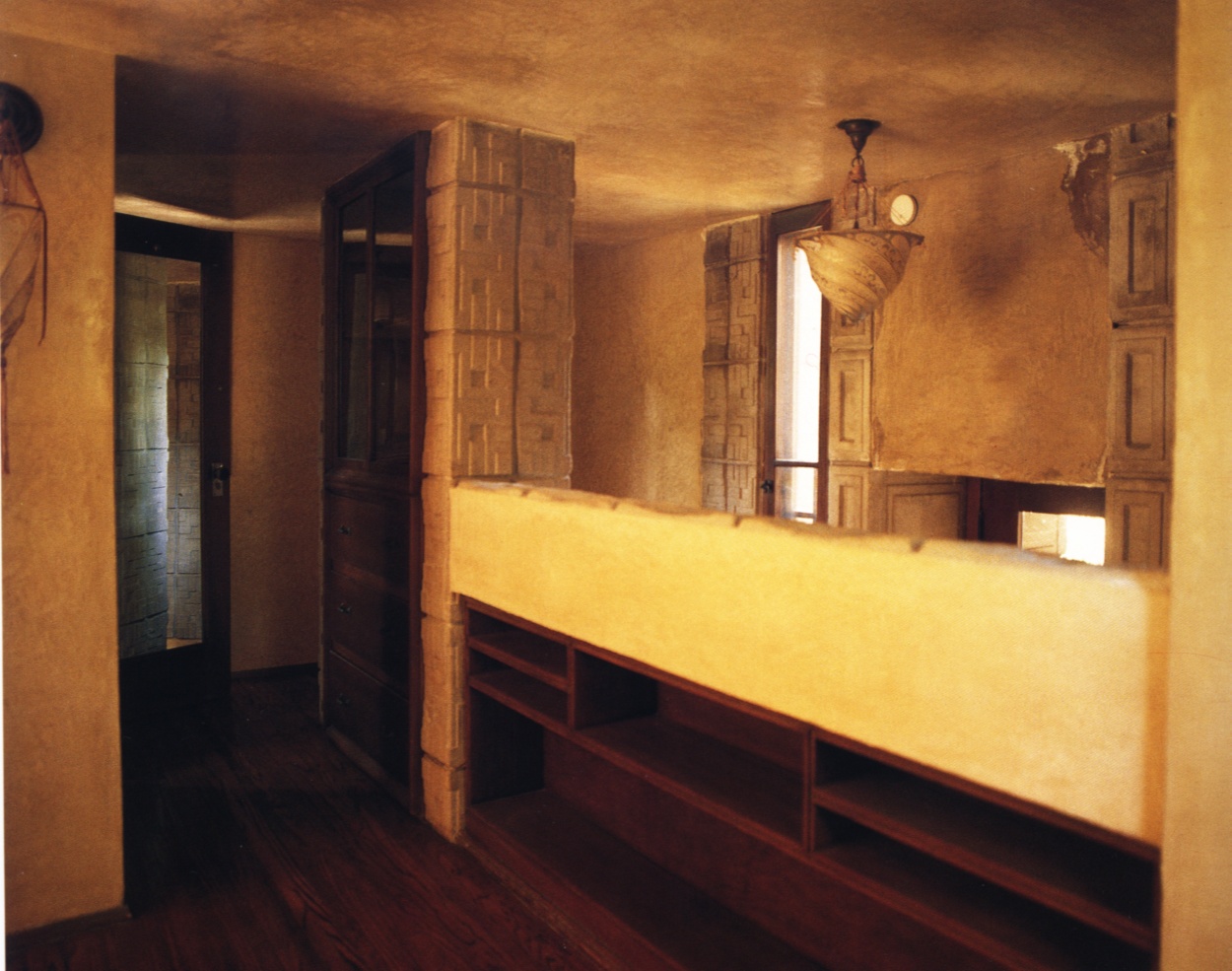 Construction of the Derby house was proceeding simultaneously; for both buildings Wright used perforated block as exterior screens for stuccoed wood-frame construction—a less complicated, and thereby less expensive, way to build than his father’s concrete-block structures. A two-story space, finished with a concrete floor and concrete-block details, dominates the gallery interior. At one end are a kitchenette and sitting area with fireplace; above are a small bathroom and balcony area. Wright made minoralterations to the gallery in 1932.