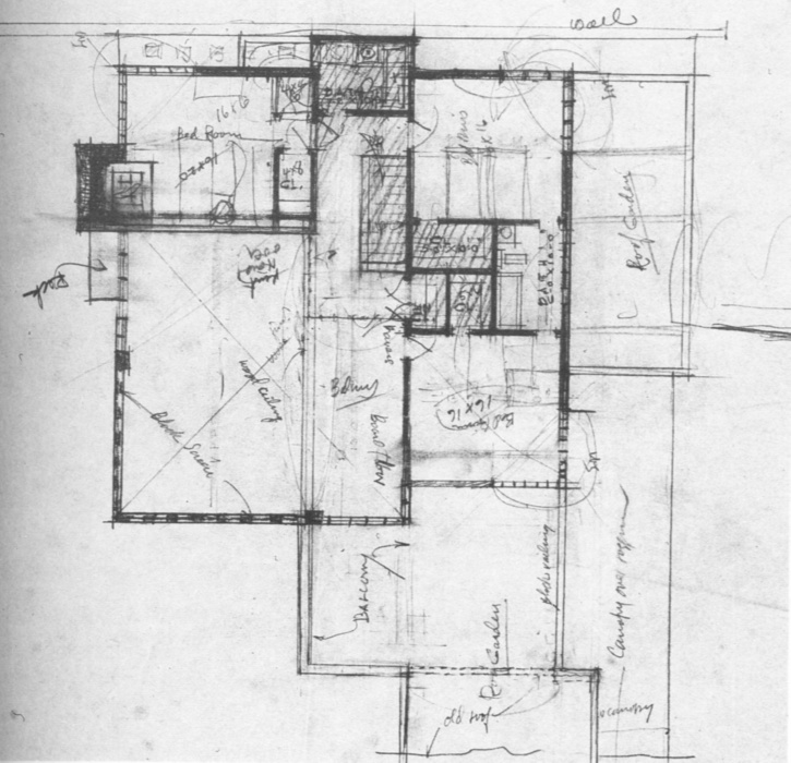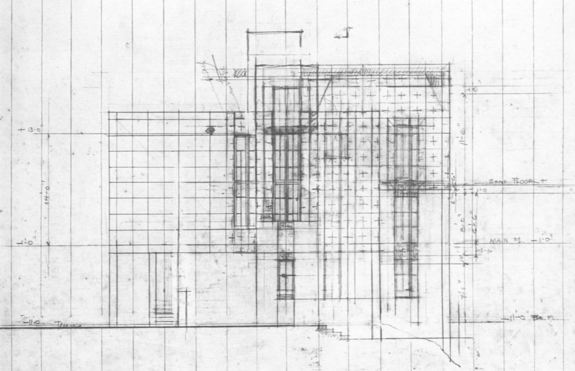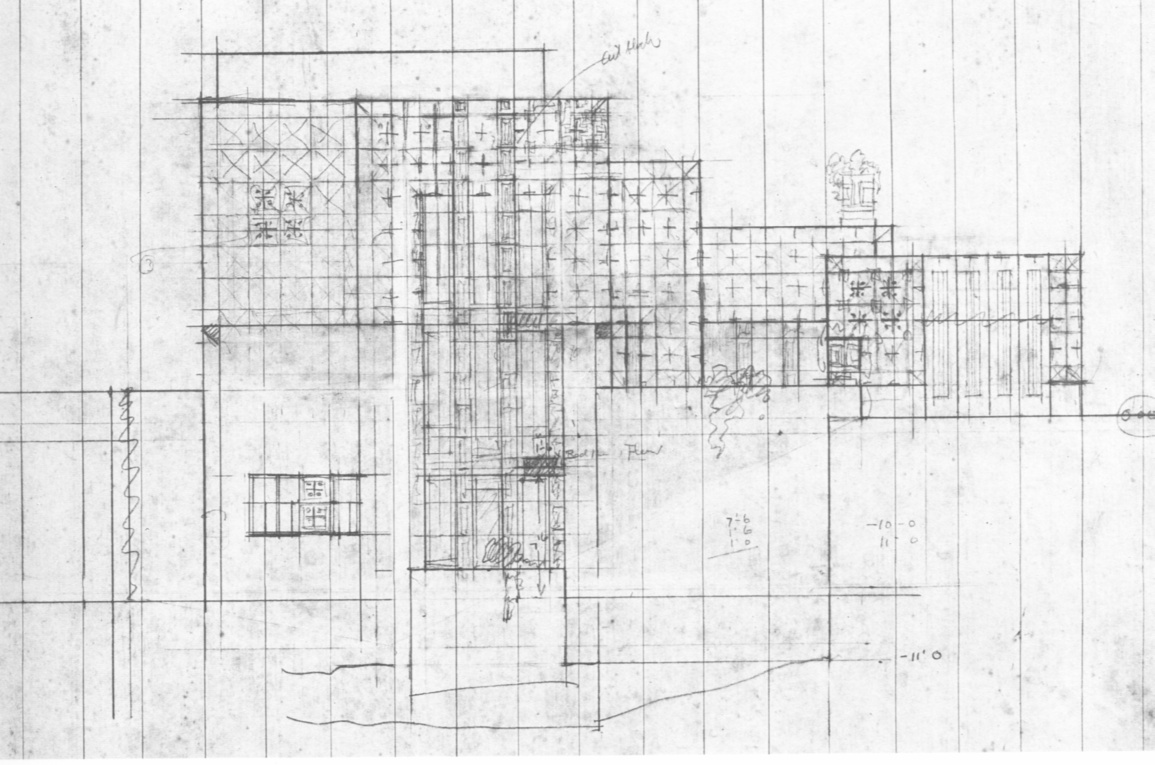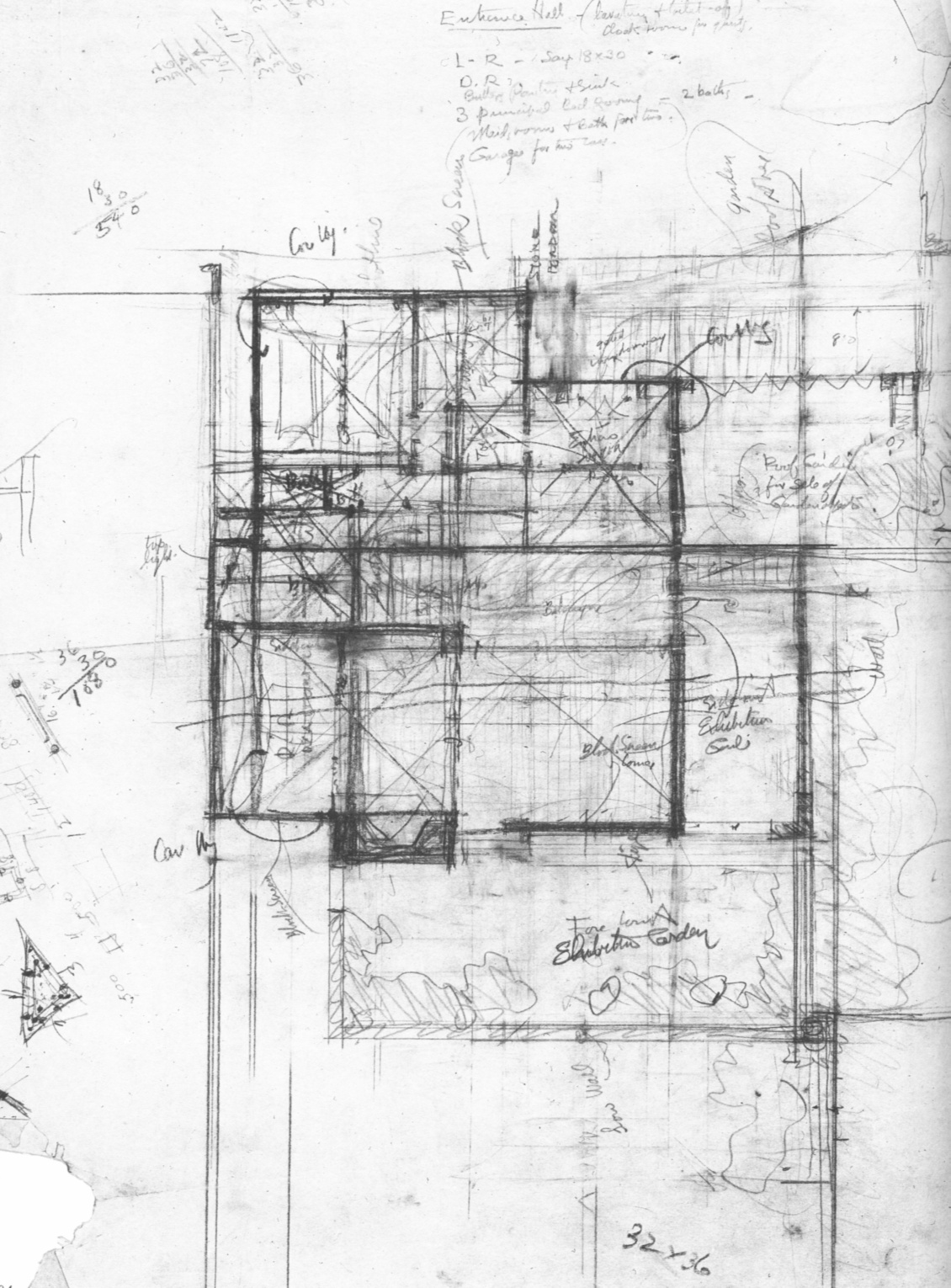 The first two sketches here present a design for the Millard ravine property that is not the famous block house known around the world for its great beauty. It appears that in the middle of making the design for Mrs. Millard, as is evident on the next drawing, he abandoned the scheme that was similar in grammar and style to the Residence A and Residence B for Miss Barnsdall, and suddenly a new concept emerged altogether: the California textile block was born. On this remarkable single sheet of paper are contained plan, elevation, section, plot plan, details for construction and for the concrete block system to be used. Out of these ideas, on this single sheet of paper, were developed the beautiful and famous houses built in and around Los Angeles for Millard, Storer, Freeman and Ennis. This concept sketch on Plate 110 is one of the finest drawings in the entire collection. It shows his explicit thinking about a totally new idea in architecture. In this sense it is a very technical drawing, yet at the same time the rendering of the elevation with its lovely eucalyptus trees, and the quality of the design throughout is so precise, so beautifully expressed and so imaginative that it becomes a breathtaking work of art. Further studies show how his use of the unit system—the grid lines put down first on the sheet of paper before any design work commences—keeps all the parts related to the whole. In concrete block construction, such a unit system is essential not only in design but in working drawings and is often employed in the elevations and sections as well. From this point on, in all his work the unit system became for him what the staff and the measure lines are to the musician. The analogy to music, in his architecture, is a strong one. He loved music second only to architecture, and regarded fine building comparable to a symphony of Beethoven an edifice of sound.