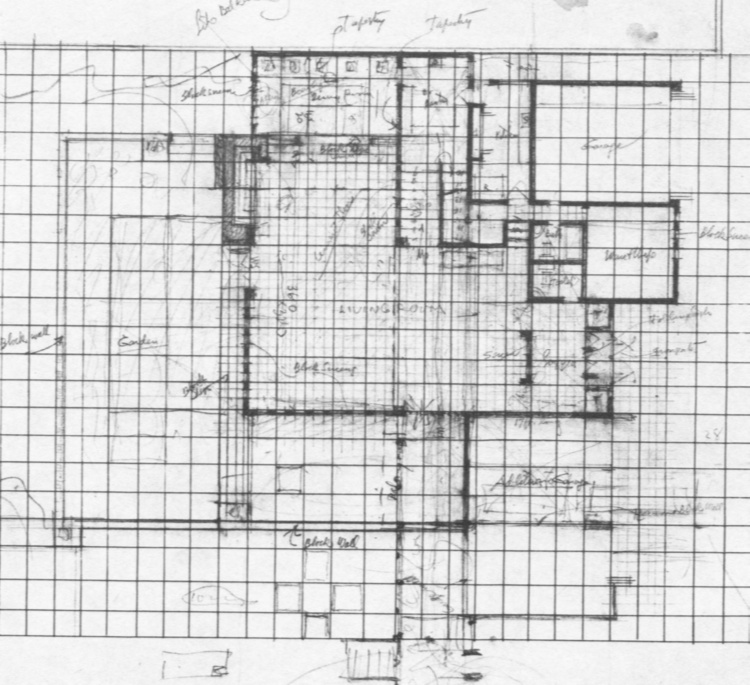 前面兩張草圖表現了Millard豐富的資產並非是在世界因為漂亮而有名的方塊形房子。很明顯的可以從下一張草圖上可以看出中間的部分是設計給Millard太太的。他放棄設計給Miss Barnsdall住宅A和B相似基礎和樣式的方案,突然以新概念一起表現出來:加州織物般的塊體於是產生。值得注意的是單單在這一張紙上包含了平面圖、立面圖、局部圖、局部平面圖、建造細部圖和被使用的混凝土塊體系統。除了這些想法之外,在這單張紙上,建立了在Los Angeles蓋給Millard, storer, Storer, Freeman和Ennis漂亮而有名的住宅。這個想法的草圖在圖110這張上是所有收集到畫得最好的一張。它很明確地表現出他在建築上完整的新想法。在這張表現上,它專業的表現法,同時還有一同表現在立面圖上的可愛桉屬樹,設計的想法絲毫不差地全部表現出來,這是多麼美麗的表現和令人吃驚的富於想像力的藝術表現工作。 進一步地分析可以看出他使用了單元系統--在開始著手設計時就已經將方格紙的線條放在紙上--讓全部的每一部分保持這樣的關係。混凝土方塊的建築樣式,如此的單元系統不僅用在設計上,在繪圖上也常常被運用到立面圖和局部圖。從這個觀點上,單元系統的整個工作標註和尺寸線都變得很有規律。類似音樂一樣,在他的建築上強烈地表達出來。他愛音樂僅次於建築,他注意好的建築得要像貝多芬交響樂的聲音一樣有組織。
