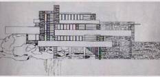 2.橫向建築發展,開放式平面:不規則的平面。層次的轉換:外部空間--中界空間--內部空間,運用瀑布、林木融入於設計之中。 3.空間是成長出來的。以壁爐為中心,以十字平面向外生長,利用幾何體堆疊、變化,重覆運用長方體、面之元素層層水平、垂直重疊。洞穴觀念,低矮入口,大廳挑高;使用自然材料。 4.懸臂梁的運用:具體實現將居住場所融入自然,鋼筋混凝土提供新的出發點,由自然岩石伸出自由浮懸的平台,不同高度的平台在濃密的樹林山谷中達到平衡。水平方向:懸壁外伸之平台與垂直方向:長條玻璃窗與的岩石造的牆壁與壁爐形成相對比的幾何形組合。懸臂梁之突破運用使大草原風格不在受限於地平線上的延伸。 |