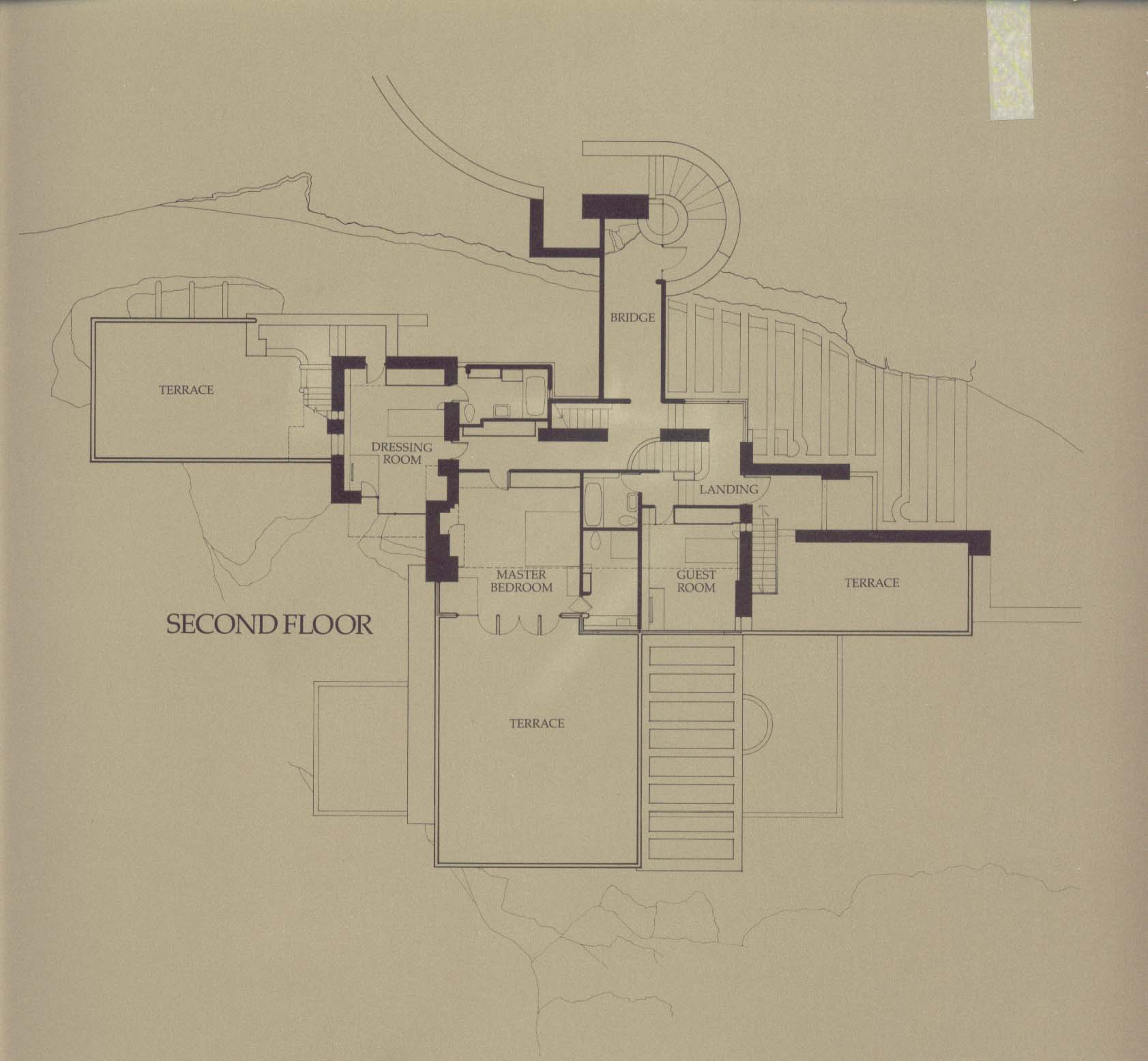 | 綜合評論 | 萊特並沒有自滿於結構表現主義的跡象,而是將結構做為達到目的手段。大膽而創新的使用懸臂樑結構,實現其欲表現之建築理念,讓水平伸展不在侷限於平地,而是創造出飛翔凌空的伸突。其水平:外伸的平台與垂直的壁爐、柱體等建築元素融合交錯,除自身建築物之外更與基地周圍環境展生共鳴,特別是與瀑布溪流的垂直水平互動,構成一幅具張力與生命力無限的絕世佳作。室內外的轉換與連結成功表達出其有機建築的想法讓建築物像是從基地裡''長''出來的,與大自然是生命共同體。整座建築物利用正反相對的力,以空間的形式,水平地、垂直地、對角地交相穿戳疊架而致微妙均衡的曠世佳作。 |