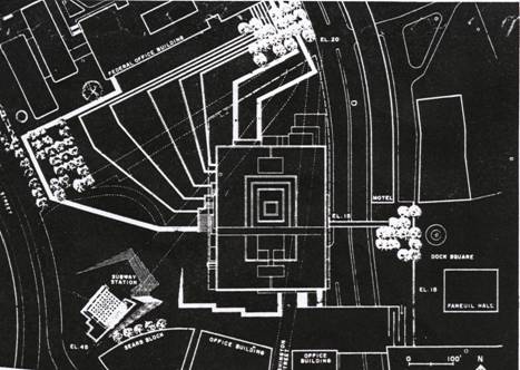 西元1950年左右,波士頓市政府的各部門機構由於分散在老市中心區各處,使行政效率極差;1959年三位規劃師(Adams, Howard, Greeley)建議將衰退的市中心區更新,經當時市長與發展部長同意新市政中心,並委託貝聿銘事務所負責這整個地區之規劃工作。貝聿銘事務所保存了一些具有紀念性的古老建築與街道,並簡化22條複雜道路為四條南北走向和二條東西走向的通路。主要的,貝聿銘事務所確定了新市政廳的雛型及其周圍新建築群的關係。
