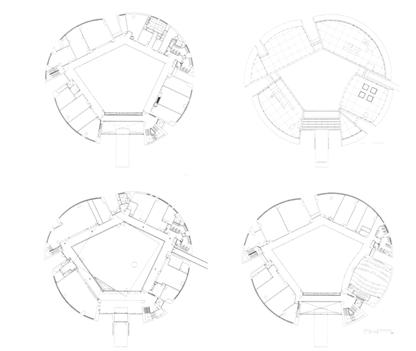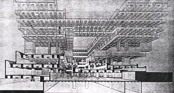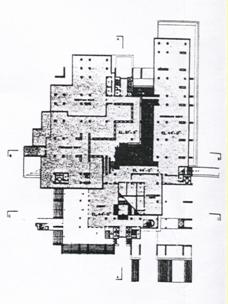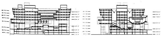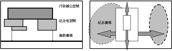 3個主要空間部分(集散廣場、紀念性空間、行政辦公空間)各自水平發展垂直組合