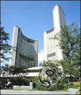 本案為市長Nathan Phillips任內提出的計畫案。1957舉辦國際競圖,總共有來自42國520件設計案參加。 由芬蘭籍建築師Viljo Revell贏得競圖。因Revell非加拿大的註冊建築師,所以以加拿大的John B. Parkin事務所為當地的配合事務所。 工程開始於1961年12月7日,1965年9月13日開放使用。而Revell於完工開放前10個月即已去世。 |