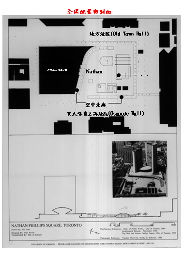 Phillips Square。廣場周圍以一層樓高的空中走廊界定,整合了市政廳本身,和東西兩側的法院建築:廣場東側為地方法院(Old Town Hall),西側為安大略省上訴法庭(Osgoode Hall)。 二、建築空間 1.