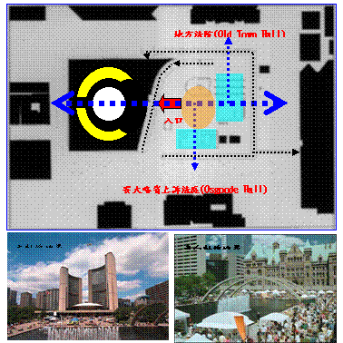 配置成南北向,南向面對廣場,北向為Toronto中心方向。主入口位於主軸線上,主軸線正對議會廳圓心。 2.