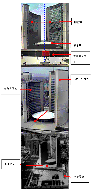 建築機能:以碟形「議會廳」&雙塔「市政辦公室」形成明顯對比。兩層樓的底座則融合了「市政」與「議會」功能。 3.