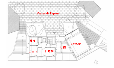 一、都市紋理 1.建築物位於城鎮邊緣,南向面對松樹林,北向為Espana廣場。廣場為Main Street的延伸,基地南邊有約2m高差。 二、建築空間 1.建築機能為混合市政府與議會的形式。建築空間以大廳分為兩部分,東半部為議會廳(2F),西半部為市政府行政辦公空間(3F)。 |